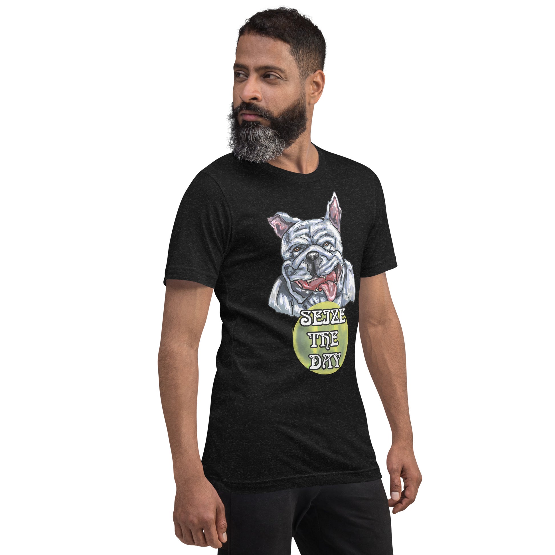 This t-shirt is a great gift for any dog lover. The bulldog is waiting in anticipation to catch hold of the day.